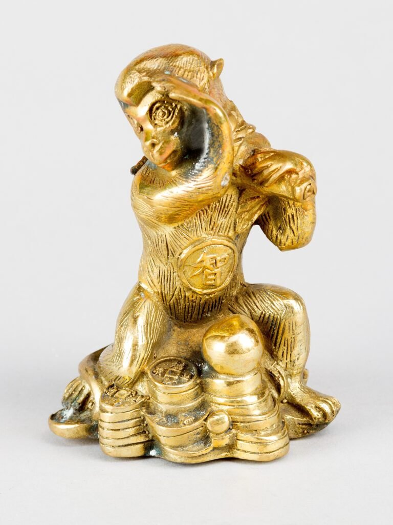 Polierte, goldfarbene, vollplastische Bronzeskulptur, naturalistische Darstellung des stehenden Affen mit einem Pfirsichzweig auf einem angedeuteten Hügel aus Glücksmünzen und Edelmetallbarren, vermutlich Glücksbringer und Neujahrsgeschenk zum Jahr des Affen des asiat. Mondkalenders (1932, 1944, 1956, 1968, 1980, 1992, 2004, 2016, 2028), gravierte 4-Zeichen-Bodenmarke.