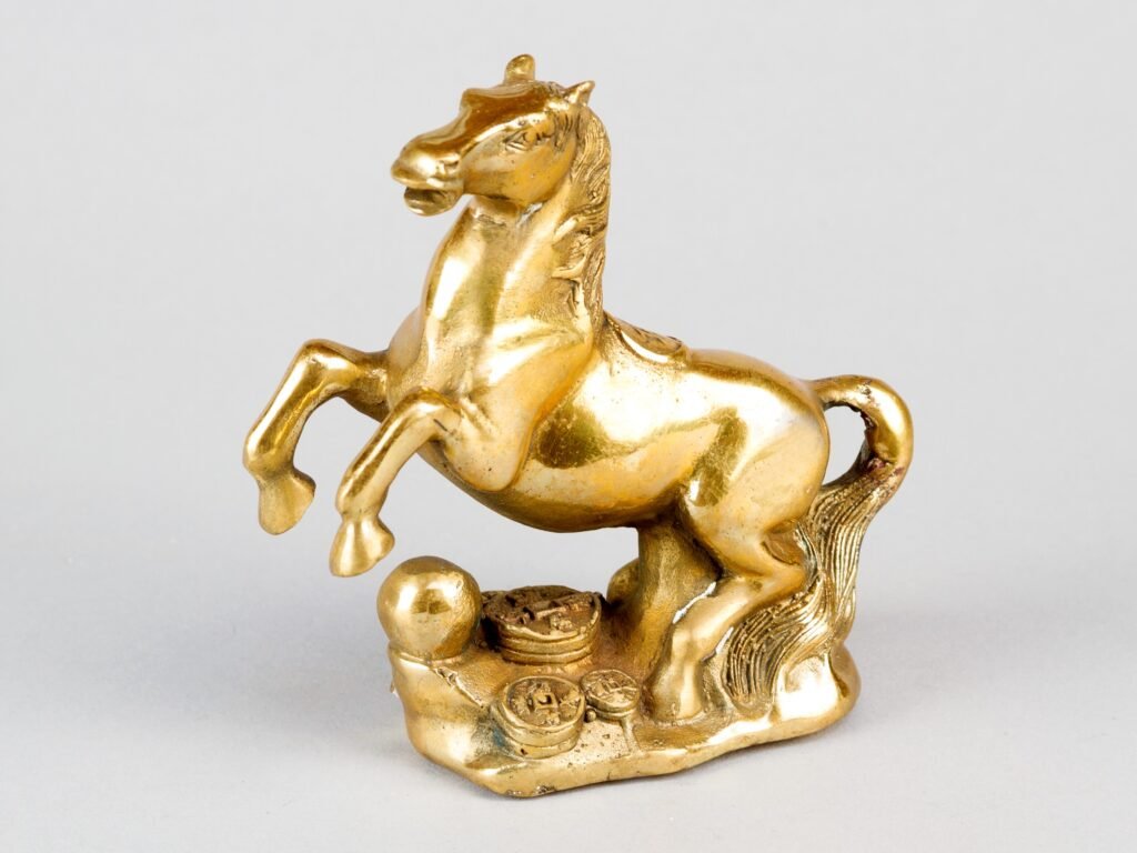 Polierte, goldfarbene, vollplastische Bronzeskulptur des Pferdes stehend auf einer integrierten Bodenplatte und umgeben von Glücksmünzen und Edelmetallbarren, vermutlich Glücksbringer und Neujahrsgeschenk zum Jahr des Pferdes des asiat. Mondkalenders (1930, 1942, 1954, 1966, 1978, 1989, 2002, 2014, 2026), gravierte 4-Zeichen-Bodenmarke.