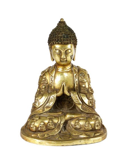 Polierte Bronze,die Gottheit sitzend, die Hände in Gebetshaltung gefalltet, reich verziertes Gewand mit plasitschen Buddhareliefs in verschiedenen Andachtsformen reich geschmückt,auf integriertem Sockel, Kupferbodenplatte.
