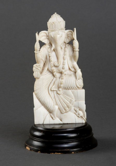 die Gottheit mit dem Elefantenkopf gilt den Hindus als Gott der Weisheit, als Vermehrer des Reichtums und Förderer der Fruchtbarkeit, gleichzeitig ist er der Schirmherr der Wissenschaft, der Schreibkunst und der Schule, gekrönte, vierarmige Darstellung mit zahlreichen Attributen und Symbolen, auf rundem Thronsessel, der mit Girlanden geschmückt ist und oben in einem Baldachin endet, auf integriertem, halbrundem Sockel, perfekte Erhaltung, montiert auf rundem Holszockel.
