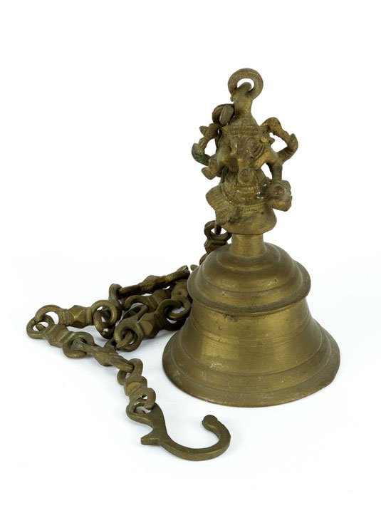 Glockenmetall mit dunkler Patina, leicht ausgeschwungener Klangkörper, umlaufend verziert mit Floralmotiven, Lotosknospen und -blättern in flachem Relief, Aufsätze in Form eines vollplastischen, tanzenden Ganeshas, der Elefantenkopf mit Öse, an der eine lange Metallkette hängt, die in einem geschwungenen Haken endet, die Kettenglieder in angedeuteter Vajra-Form, volkskundlich interessantes Relikt.