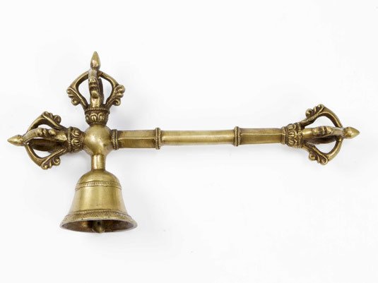 Goldfarbene Bronze mit schöner Patina, Ghanta, die Glocke als Sinnbild der Vergänglichkeit, das die Weisheit und das Ziel repräsentiert, der runde bzw. gekantete Bronzestab ist oben und unten jeweils von einem halben Vajra begrenzt, zusammen gelten sie als Symbol, das zur Erleuchtung führt, in übertragenem Sinne: Weg und Ziel sind eins.