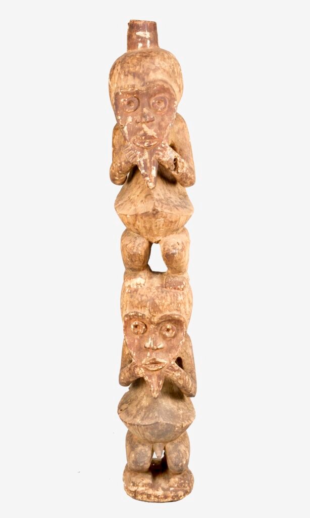 Holz mit brauner Patina, die tlw. abgeblättert ist, männliche und weibliche Figur in kraftvoller Statur übereinanderstehend, die Köpfe von den Händen gestützt, herzförmige Gesichter mit stammestypischen Zügen, Portalpfosten vor der Versammlungshütte für die Inaugurationsriten der männlichen und weiblichen Stammesjugend, seltenes Kultobjekt mit subtiler, erotischer Ausstrahlung, auf runder, integrierter Holzplatte, min. altersbed. Schäden.