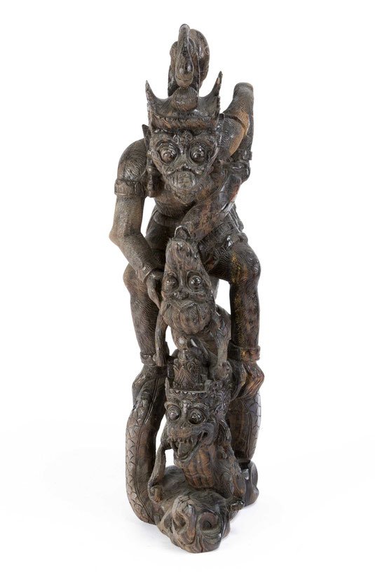 Holz mit polychromer Fassung, die das stilisierte Federkleid betont, aufrecht stehend auf einem angedeuteten Felsen, im buddhist. Ritual steht die Ente für die Unterdrückung des Bösen.