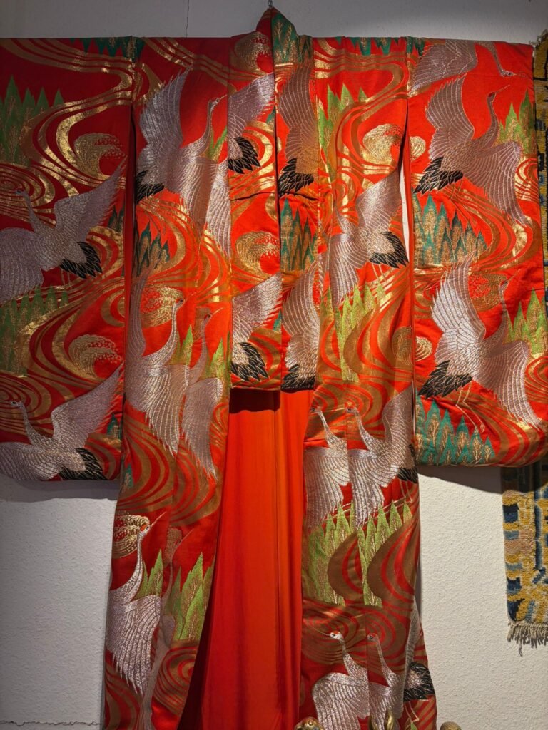 Zeremonialkimono, aus kräftig rotem Textil, beidseitig reich dekoriert. Auf Vorder- und Rückseite großflächige Darstellungen von Pfauen mit ausgebreiteten, fächerförmigen Schwanzfedern in Grün, Blau und Weiß, kombiniert mit üppigen, goldfarbenen Blütenmotiven (Pfingstrosen) mit feiner Stickerei. Die Pfauen sind dynamisch angeordnet und bilden zusammen mit den floralen Elementen eine ausgewogene, fließende Gesamtkomposition.