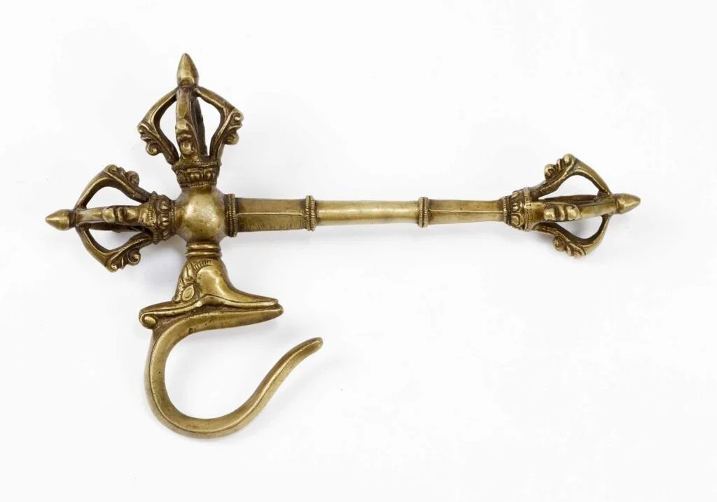 Goldfarbene Bronze mit Patina, tlw. Vergoldung, seltenes Zeremonial- und Kultobjekt, ursprünglich ein Stachelstock, um Elefanten zu lenken, ein Haken, mit dem man die Zweifler symbolisch zur Lehre Buddhas ziehen kann, der Haken entspringt einem Makara-Maul, der runde Bronzestab ist oben und unten jeweils von einem halben Vajra begrenzt.