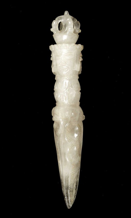 Großer, tib. Ritualdolch aus einem massiven Bergkristall vollplastisch herausgearbeitet, diese großen und schweren Exemplare dienten nicht zur Bannung von Dämonen und zur Durchführung anderer, magischer Rituale, sondern waren Verehrungsobjekte auf den Altären wichtiger, tib. Dharmapalas oder Schutzgottheiten, bei diesem aufwendig gearbeiteten Exemplar wird das Griffstück von den 3 Köpfen des Dharmapala Hayagriva, dem Beschützer der Heiligen Schriften, gebildet, bekrönt von einem halben, fünfstrahligen Vajra, dreikantige, verzierte Bergkristallklinge, museales Sammlerstück in perfekter Erhaltung.