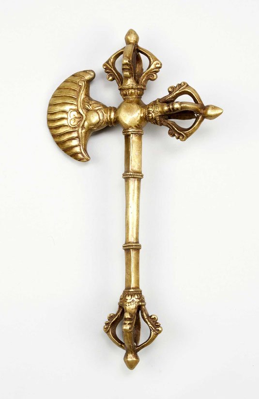 Goldfarbene Bronze mit schöner Patina, seltenes Zeremonial-und Kultobjekt, das stilisierte Kampfbeil steht symbolisch für die Absage an alle weltlichen Dinge, der runde bzw. tlw. gekantete Bronzestab ist oben und unten von einem halben Vajra begrenzt.