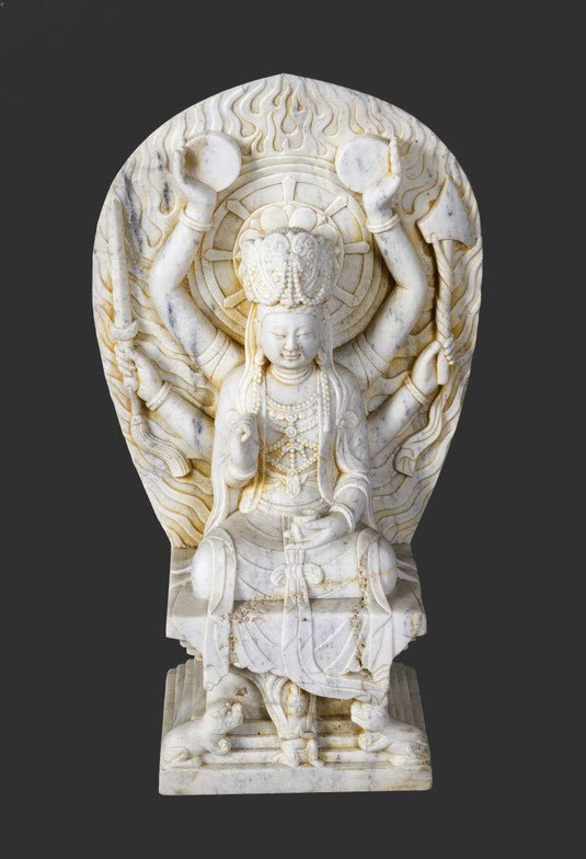 Weißer Marmor, die prachtvolle Gestalt der Muttergottheit sitzt aufrecht im Lotossitz auf gestuftem -thron, die Hände halten jeweils einen erblühten Lotos, die Finger mit symbolischer Haltung, das Haupt mit einer verzierten Bodhisattva-Krone geschmückt, ebenfalls reicher Ohr- und Brustschmuck, min. alte Fehlstellen, unbed. für den sonst guten Gesamteindruck.