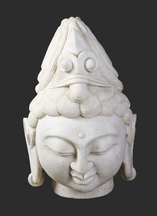 Weißer Marmor, schön geschnittenes, meditatives Gesicht der Muttergottheit unter einer hohen Bodhisattva-Frisur in geflochtenen Zöpfen und geschmückt mit einem Diadem, lange Ohrläppchen mit Ohrringen.