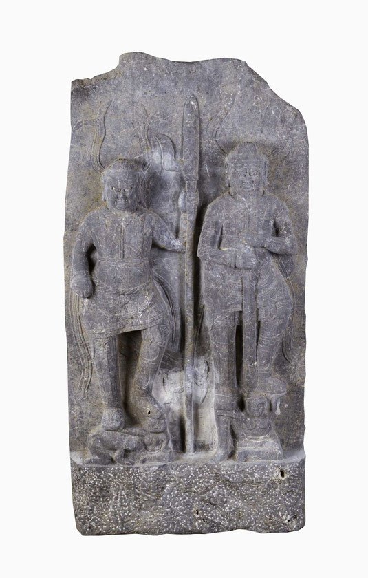 Dunkles Marmorfries, plastisch aus dem Material herausgearbeitetes Halbrelief von einem Wächterpaar mit traditioneller Bekleidung und Kopfbedeckung, bewaffnet mit Hellebarde bzw. Schwert, starrer, unheilverbreitender Gesichtsausdruck, zu ihren Füßen besiegte Gegner in gekrümmter, demutsvoller Haltung, dekoratives, großes Relief, altersbed. Bruch- und Schadstellen.
