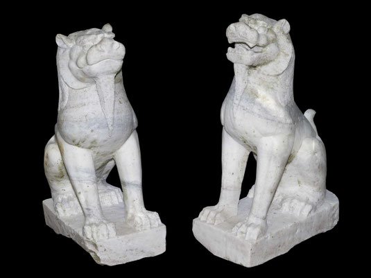 Weißer Marmor, das sitzende Tier mit ausgeprägter Kopfpartie mit weit geöffnetem Maul, auf integrierter Marmorplatte, imposante Tierplastik, ursprünglich zur Abwehr „Böser Geister“ vor Palasttoren, besch., kleine Abplatzungen.