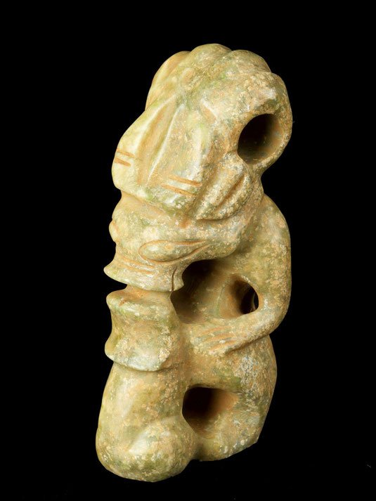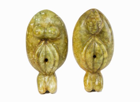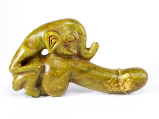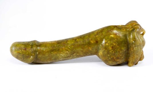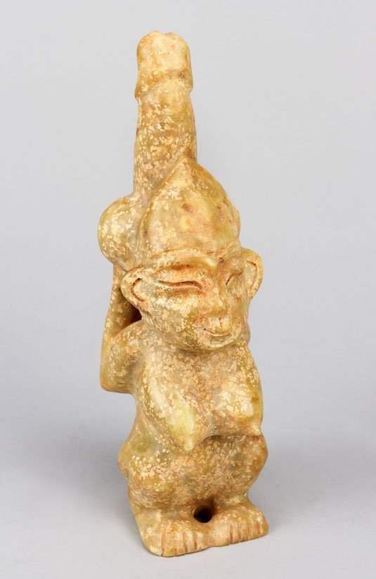 Aus gelb-brauner, gefleckter Jade (Nephrit), vollplastische, kniende, archaisch anmutende, weibliche Figur mit festen, spitzen Brüsten, die nach hinten abgewinkelten Arme halten einen kurzen, eregierten Phallus, der sich hoch über das Haupt reckt, dämonenhafte Gesichtszüge einer Frau der chin. Minderheit.