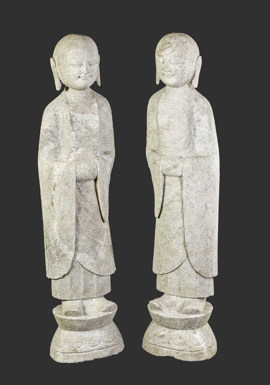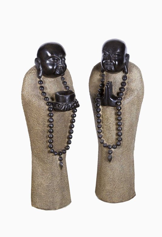 Hellgrauer Naturstein mit Hammerschlagdekor, das ausdrucksstarke, kahle Haupt in dunkel gehalten, eine lange Gebetskette zieht sich über den Körper, die Hände in Andachtshaltung umfassen eine Almosenschale, eine attraktive, fast modern anmutende Steinskulptur.