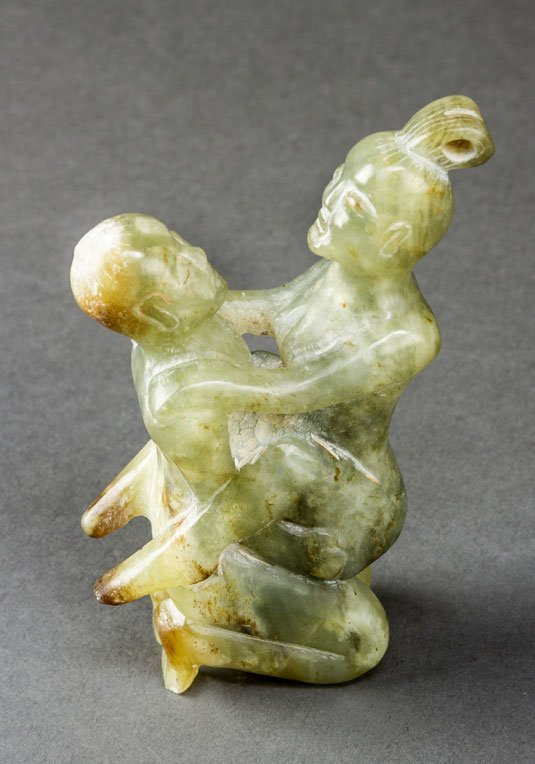 Grüne Hunan-Jade mit natürlichen, gesteinsbed. Schlieren und dunklen Stellen, vollplastisch gestaltetes, nacktes Liebespaar bei intimen, erregenden Sexpraktiken.