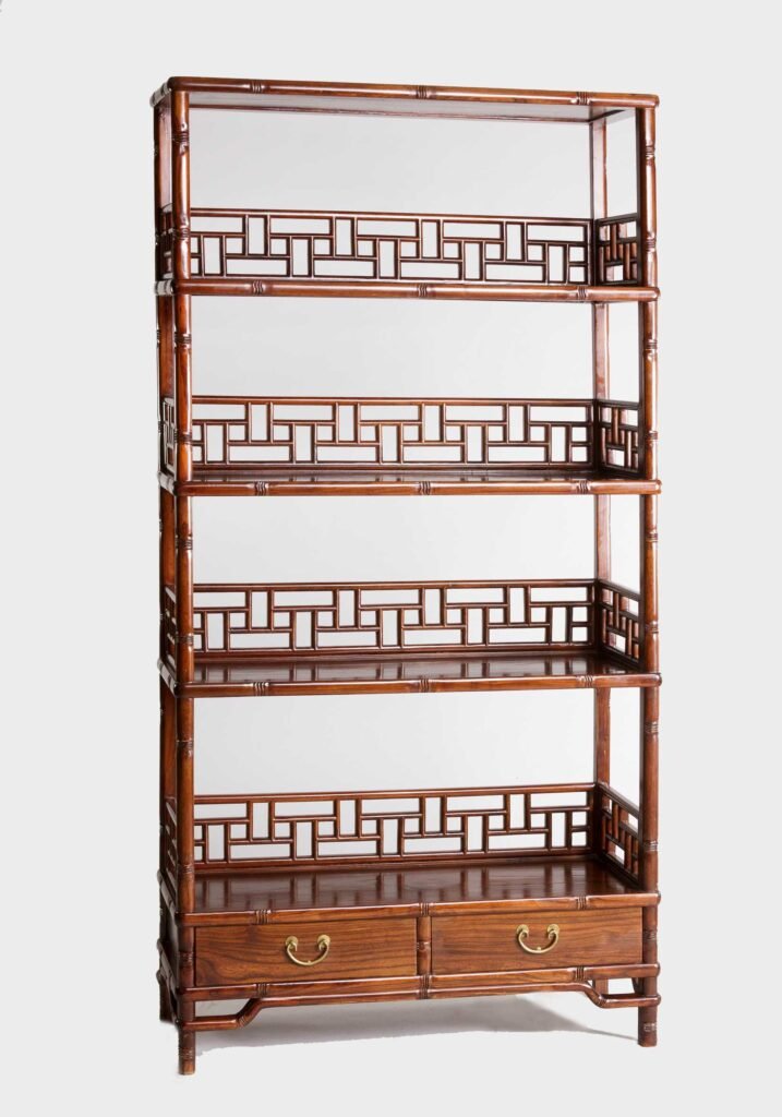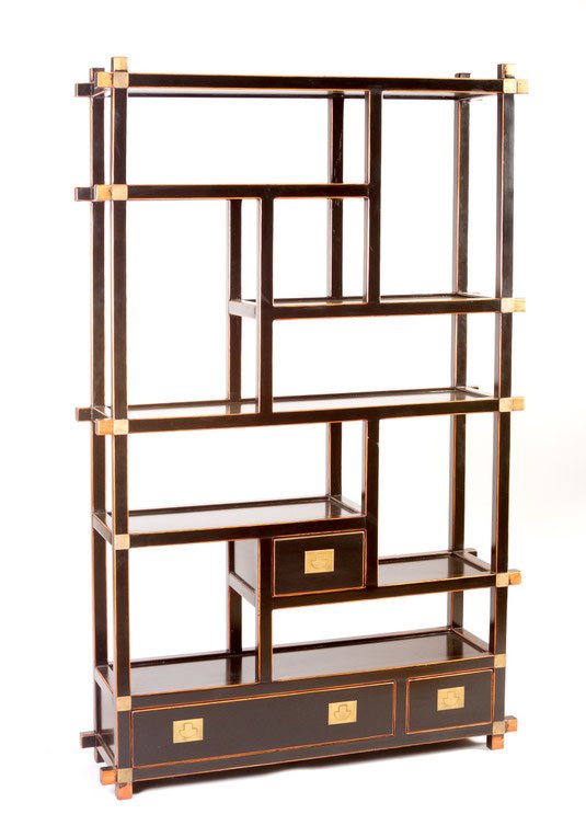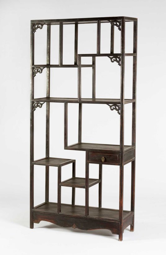 Dunkelbraunes, trop. Edelholz, in einem stabilen Rahmen eingebettet zahlreiche, nach allen Seiten offene, gestufte Etagen zur Aufnahme von Kuriositäten, Kleinkunstwerken, Büchern, etc., in einigen Ecken Zierelemente, 3 kleine Laden, verzierte Sockelleiste.