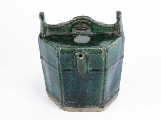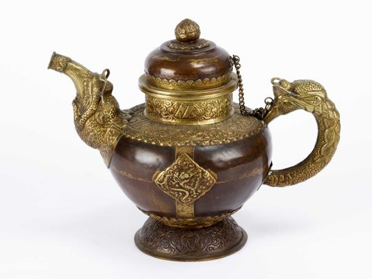 Teekannen CHINA Kanne-001 Provinzielles Wassergefäß China, Qing-Dynastie. Terrakotta mit monochromer dunkelgrüner Glasur inForm eines 6-eckigen Holzkübels mit Tragegriffen und kurzem Ausguß,Füllstutzen mit Deckel, H: 20,5 cm, B: 19 cm, T: ca. 20 cm Preis: 140€ Contact TIBET Kanne-002 Wasser-/ Teekanne Tibet, 19.Jh.. Kupfer, runde Form, die Wandung mit beidseitigaufgesetzten Garudas, Schulter und Sockelbereich mit reliefiertenFloralmotiven, Griff als vollplastisches Fabeltier ausgebildet, Ausgussdurch einen gehörnten Fabeltierkopf, eingepasster Deckel mit Knauf inForm einer Blütenknospe mit Kettchen am Griff verbunden. H: 18 cm, B: 22 cm Preis: 220 € Contact
