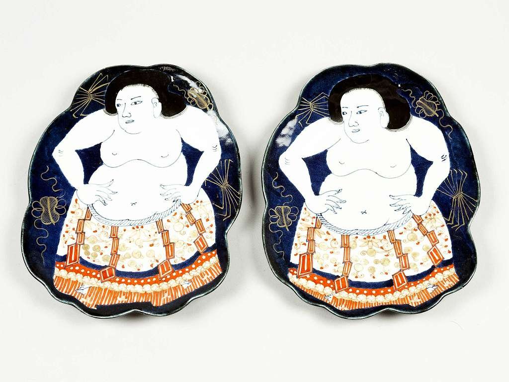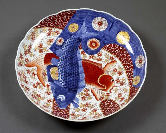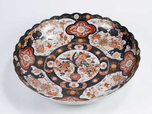Imari-Porzellan mit polychromer Unterglasurmalerei in eisenrot, kobaltblau und Gold, das angedeutete Fächerblatt mit Tempeln und Gehöften in gebirgiger Seenlandschaft, auf fächerförmigem Standring, blaue Bodenmarke.