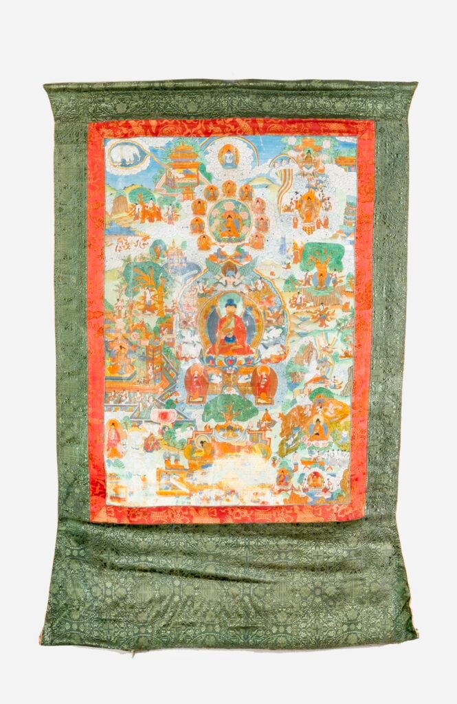 Polychrome Malerei auf Leinwand, im Zentrum rituelle Bodhisattva-Darstellung umgeben von Landschaftsmotiven mit zahlreichen Bodhisattvas, eingefasst in rote und grüne Brokatseide, Rückseite mit 3 roten Schriftzeichen als Weihemsschrift.